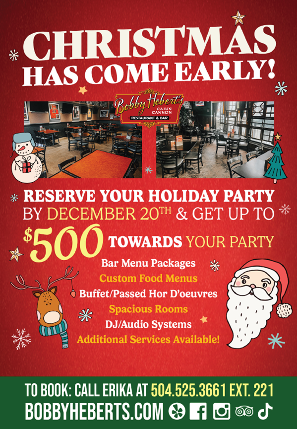 Bobby Hebert's Cajun Cannon on Veterans in Metairie is fun, fun, fun. And you can save big time ($500) when you book your holiday party by December 20th! Learn more. Call Erika at 504-525-3661, ext. 211.