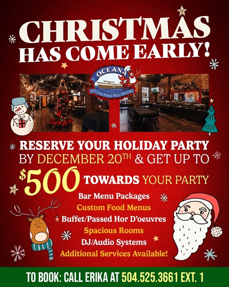 Ho, Ho, Oh, Oceana! This beloved French Quarter restaurant is the perfect place to celebrate the holidays and each other – and you can save $500 on your party if you book by December 20th. Learn more. To reserve your party, call Erika at 504-525-3661, ext. 211.