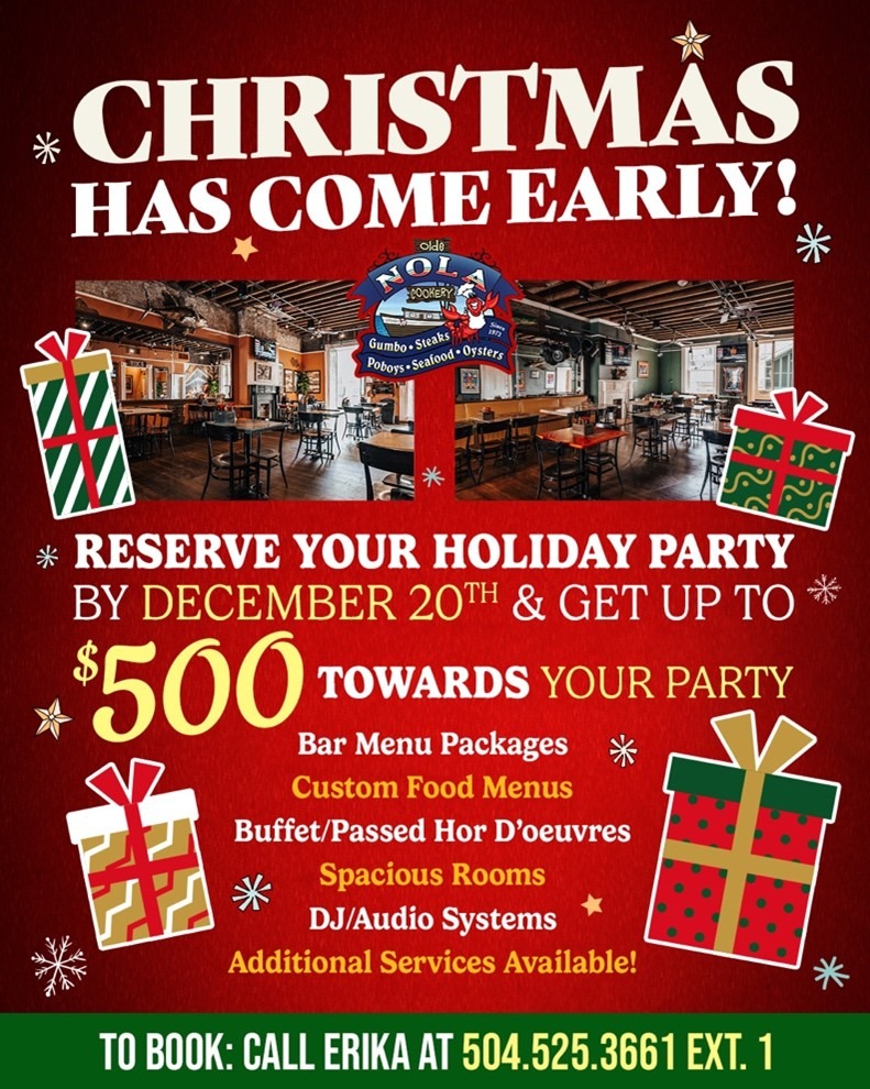 Know what never gets old? Olde NOLA Cookery on Bourbon Street. Book by December 20th and save $500! Learn more. To reserve your party, call Erika at 504-525-3661, ext. 211.
